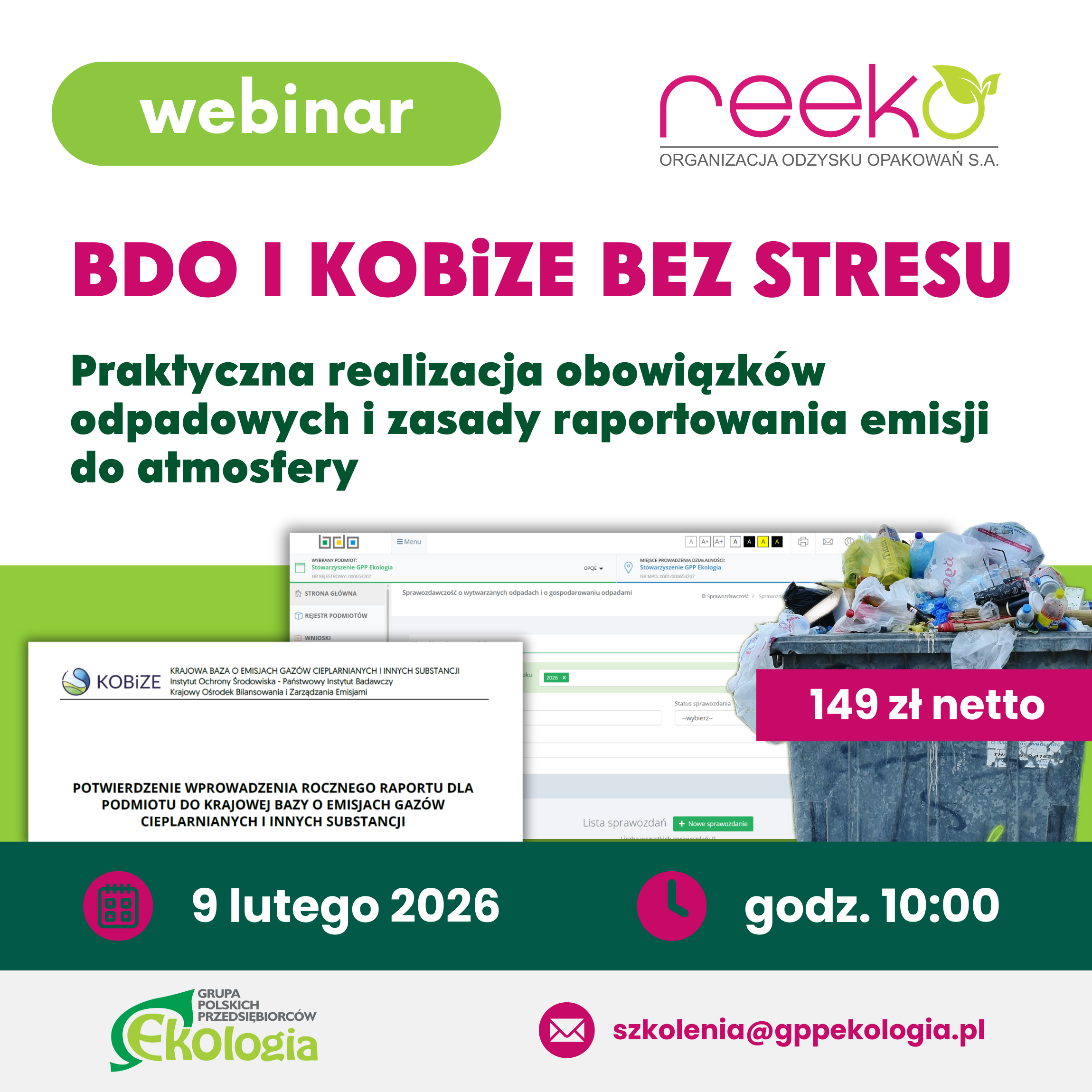 Szkolenie odbędzie się już 9 lutego br. o godzinie 10:00 i zostało przygotowane z myślą o osobach, które na co dzień mierzą się z obowiązkami środowiskowymi w firmach i instytucjach. Podczas szkolenia w przystępny i praktyczny sposób omówimy najważniejsze zagadnienia związane z raportowaniem do KOBiZE oraz prowadzeniem ewidencji i sprawozdawczości odpadowej w systemie BDO. Uczestnicy dowiedzą się, jak poprawnie przygotować dane, uporządkować dokumentację oraz sprawnie i bezpiecznie przejść przez cały proces sprawozdawczy.